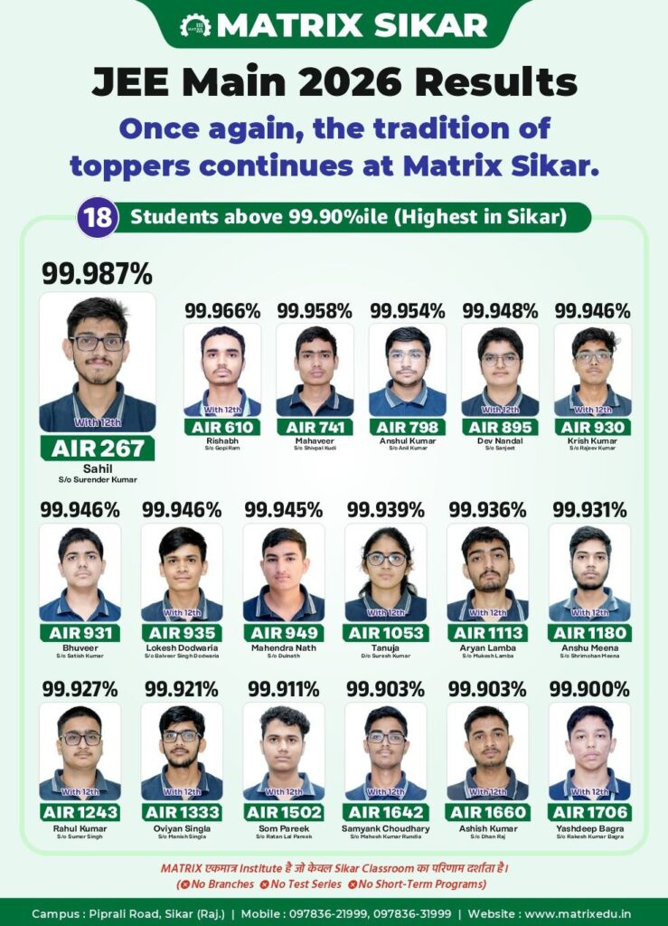 The JEE Main 2026 Session 2 Sikar topper list once again proves that consistent strategy, the right guidance, and disciplined execution are what truly separate top rankers from the rest. Whether it’s the rise of Sikar as a serious JEE hub or the dominance of institutes like Matrix Academy, the message is clear focused preparation works.